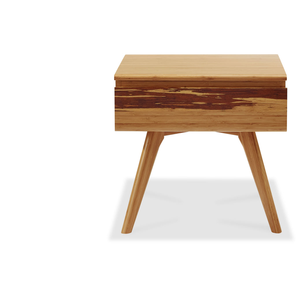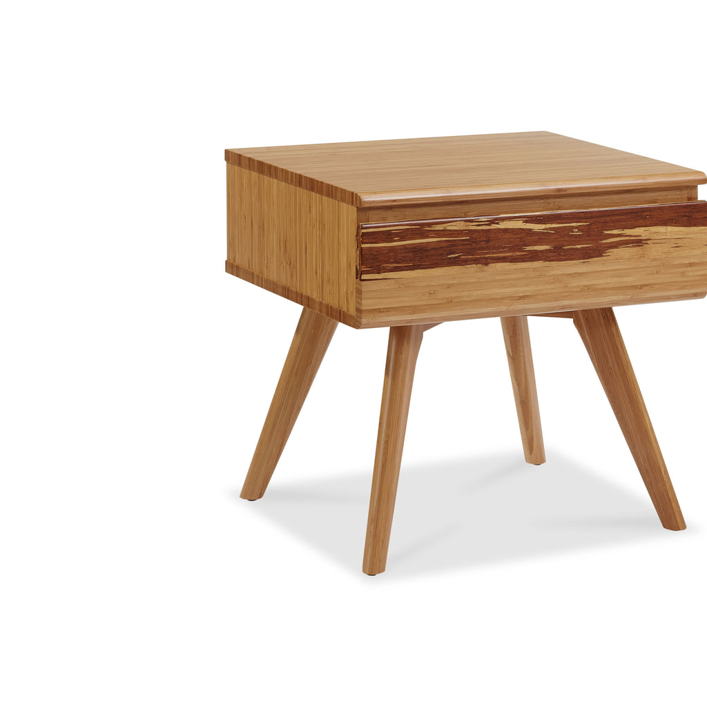 Made in solid bamboo, the Azara nightstand features sleek mid-century styling, clean lines and angled tapered legs. The accent drawer is faced in solid exotic Tiger bamboo. The Azara bedroom chests are finished on all 4 sides, feature 5 sided drawer boxes with English dovetail, hidden under mount drawer glides and soft closing drawers.
