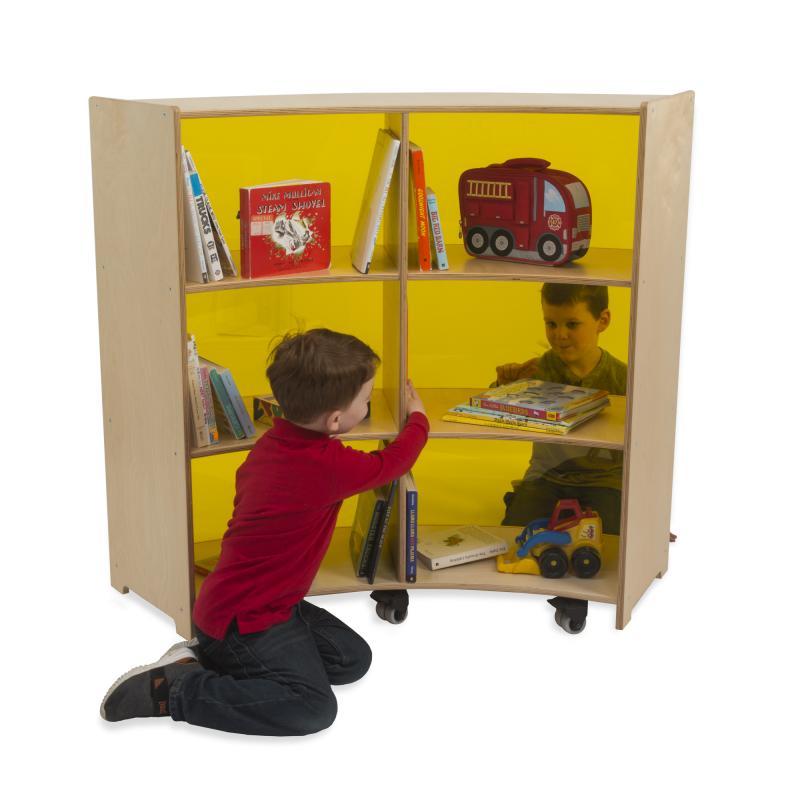 Clear yellow plexiglass-backed curve-out mobile storage cabinet that connects to create a defined area! We believe in the warmth of wood to achieve harmonious design, so our connection system for this cabinet avoids the use of unsightly plastic connectors. The cabinet features three fixed shelves with two divided storage compartments [13-1/2"D x 23-1/8"W x 12"H] on each shelf and a safe, shatterproof yellow acrylic back that improves child supervision and brightens any room environment. Two discreet pre-drilled holes on the top and bottom inside end panels accommodate fasteners [provided] that enable easy and direct connection with other WB1823 cabinets or WB1824 Curve Out Cabinet With Acrylic Back [each sold separately] to create a seamless and flexible customized area layout. All corners and edges are rounded over and finished smooth for safety. Mounted on six heavy duty non-marking lockable 2-inch casters. Constructed in beautiful, durable birch plywood in safe, non-toxic natural UV finish that won't yellow and withstands rigorous use. Made in USA. GreenGuardâ„¢ Gold certified. Lifetime Warranty.