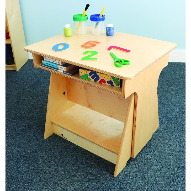 Introducing another Whitney Brothers® innovation in Early Learning furniture and winner of the 2017 Best of Year Honoree Award from Interior Design magazine and 2017 New Product Honorable Mention from School Planning & Management magazine! You'll love how the clever design enables this stylish desk to convert easily, securely and without tools from a sitting height to a standing height so Early Learners aren't sedentary, use good posture, and stay engaged in whatever the classroom activity entails. The desk surface height is adjustable from 22" to 29.5" in 1.25" increments. For seating, choose our WB0178 Chairs, Whitney Plus Chairs, or WB1685 Rolling Seat and Storage Bin [each sold separately]. Constructed in beautiful, durable birch plywood in safe, non-toxic natural UV finish that won't yellow and withstands rigorous use. Made in USA. GreenGuard™ Gold certified. Lifetime Warranty.