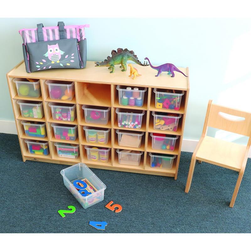 Is your classroom organized? Our 20-Tray Storage Cabinet keeps all your supplies neatly organized in 20 clear plastic trays [included] that provide easy viewing and access. The bottom dividers are slotted and can be removed to configure the storage solution that suits your specific need. Need more tray storage capacity? Check out the WB3225 25-Tray Cubby Storage Cabinet [sold separately]. Constructed in beautiful, durable 15mm birch plywood and 1/4-in back board with no visible screws or joinery for a nice finished furniture look in safe, non-toxic natural UV finish that won't yellow and withstands rigorous use. Made in USA. GreenGuard™ Gold certified. Lifetime Warranty.