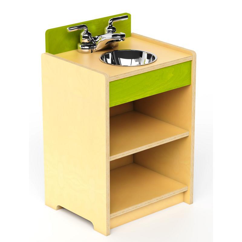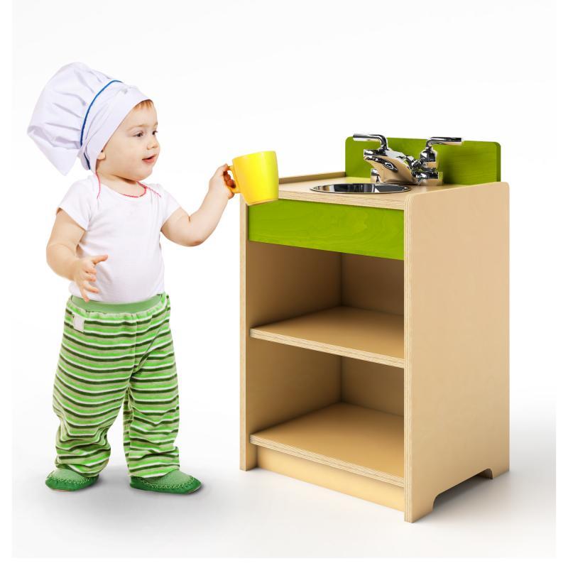 Just like home and right-sized for toddlers! Our Let's Play Toddler Sink brims with delightful character, featuring a fresh contemporary design, vibrant color, and realistic details including a chrome faucet that will inspire a toddler's imaginative play for hours. Thoughtful safety features include smoothed edges, eased corners and open cabinets without doors to prevent little fingers from getting pinched. Combine with our WB2225 Let's Play Toddler Stove and WB2245 Let's Play Toddler Refrigerator [each sold separately] to create a complete toddler kitchen ensemble! Constructed in beautiful, durable birch plywood in safe, non-toxic natural UV finish that won't yellow and withstands rigorous use. Made in USA. GreenGuard™ Gold certified. Lifetime Warranty.