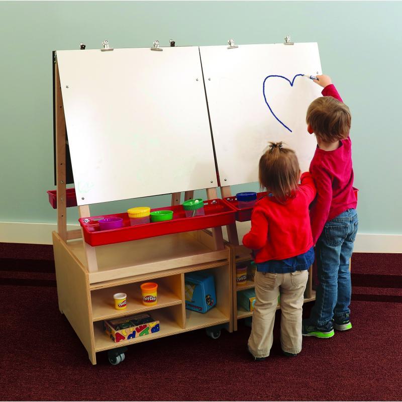 Inspire their next masterpiece! Art is a window to the world and this mobile art station provides four children a unique and stylish platform to create and express their own views. The design of the sturdy base cabinet provides ample storage for all your art supplies below and in between the removable tabletop easels. Each side of the easel includes a write and wipe panel, clips and an adjustable height paint tray. The cabinet is mounted non-marking lockable casters for handy mobility. Constructed in beautiful, durable birch plywood in safe, non-toxic natural UV finish that won't yellow and withstands rigorous use. Made in USA. GreenGuardâ„¢ Gold certified. Lifetime Warranty.