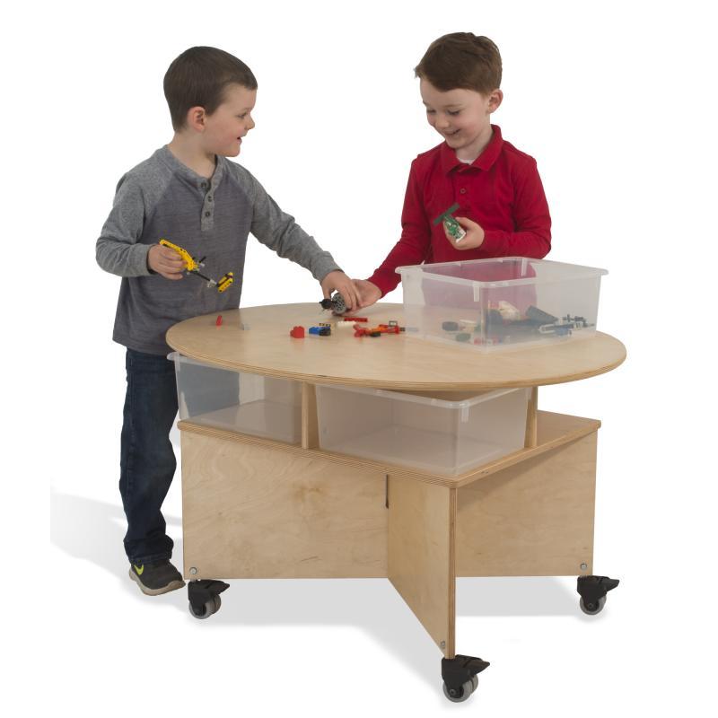 A collaboration table for up to four preschoolers! The unique shape of this table is a pleasant oval design at 24.5"H that easily accommodates four seated children. The base is a sturdy, stable, symmetrical design featuring a shelf under the table surface that holds four clear plastic trays [included] for classroom materials and makes clean up a snap. Mounted on four heavy duty non-marking lockable casters for handy mobility. The 29.5"W table fits through standard door openings. Constructed in beautiful, durable birch plywood in safe, non-toxic natural UV finish that won't yellow and withstands rigorous use. Made in USA. GreenGuardâ„¢ Gold certified. Lifetime Warranty.