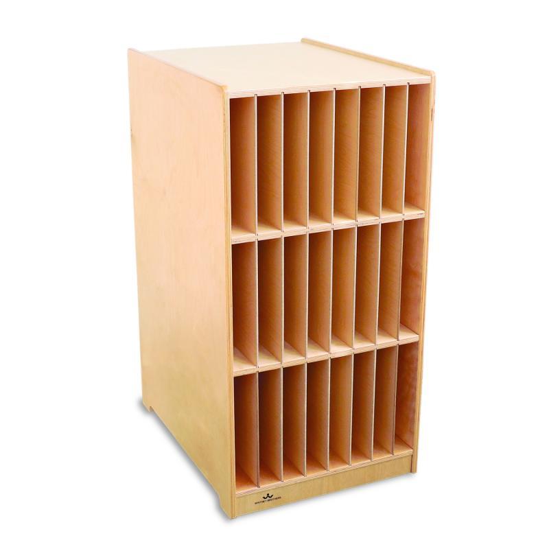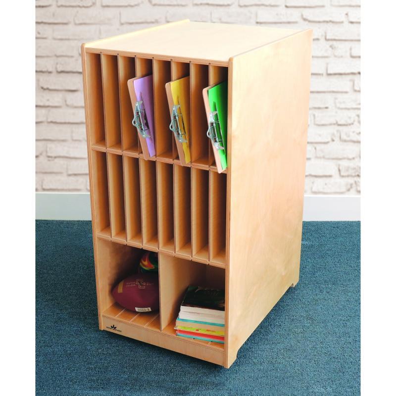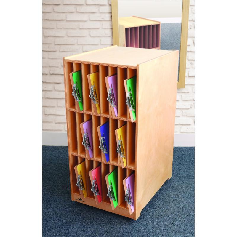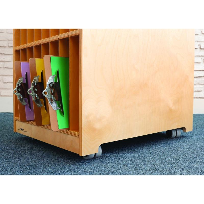 The ultimate classroom assignment organizer! This compact, versatile two-sided storage cabinet features 24 removable slotted folder partitions on each side [48 total] for clipboards, folders or classroom materials that make organizing classroom assignments a snap [folders or clipboards not included]. Lockable heavy duty non-marking casters enable the cabinet to roll out of the way when not in use. Great for a Fluency Center! Constructed in beautiful, durable 15mm birch plywood with no visible screws or joinery for a nice finished furniture look in safe, non-toxic natural UV finish that won't yellow and withstands rigorous use. Made in USA. GreenGuard™ Gold certified. Lifetime Warranty.