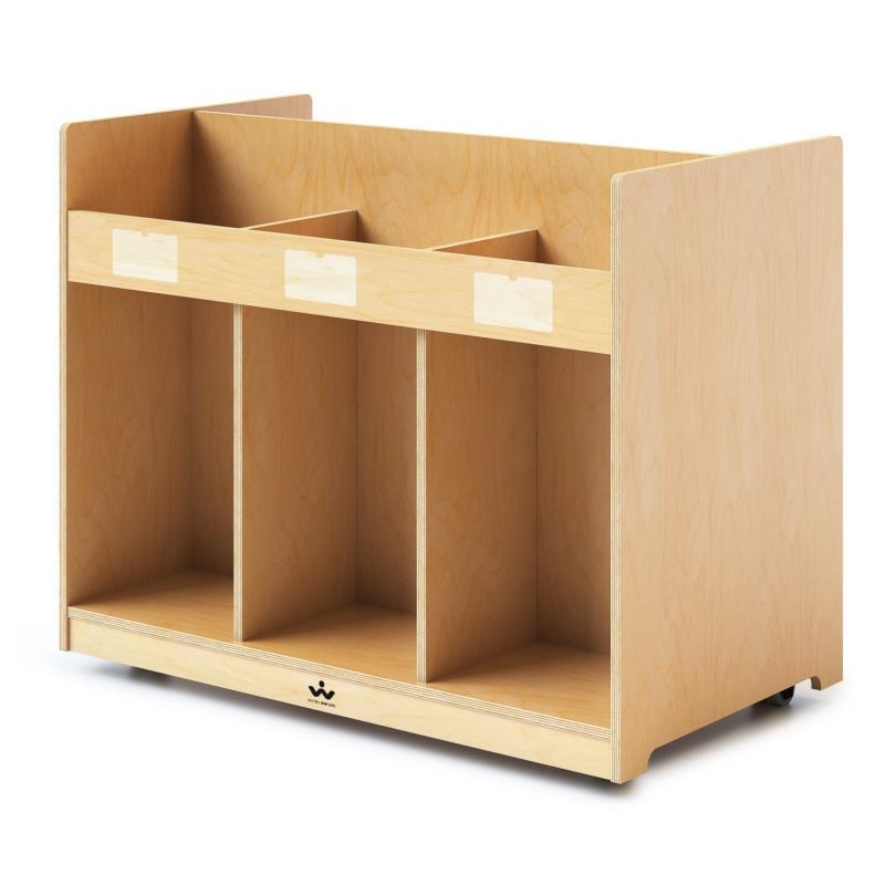 A better mobile library solution! Each side of this sturdy and functional two-sided mobile cabinet features three open divided sections [each 9.87"D x 11.75"W] over three large storage compartments [each 9.87"D x 11.75"W x 18.25"H] that provide an integrated storage and display solution for books, magazines, materials or other library supplies. Additionally, four pre-drilled holes located discreetly in the cabinet interior enable it to attach with screws [provided] to other WB1821 units [each sold separately] to create a complete mobile library storage solution! Mounted on four heavy duty non-marking 2-inch casters. Includes six self-adhesive vinyl nameplates and six 2" x 3.5" index cards for labeling. Constructed with no visible screws or joinery for a fine finished furniture look in safe, non-toxic natural UV finish that won't yellow and withstands rigorous use. Made in USA. GreenGuardâ„¢ Gold certified. Lifetime Warranty.