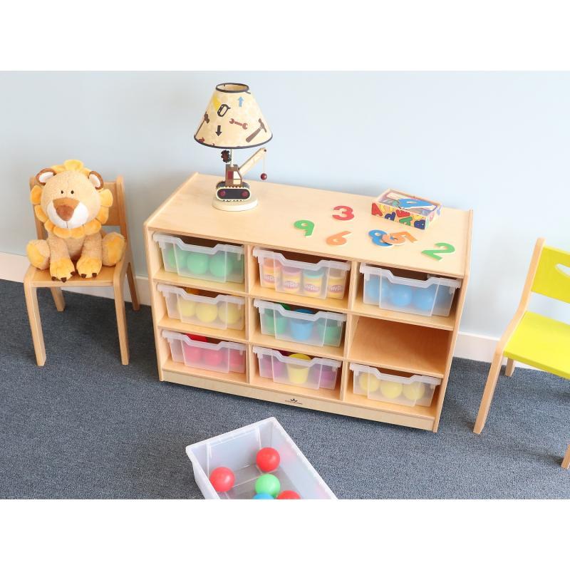 Top 15 Best Seller! This popular mobile storage cabinet features nine spacious cubby storage compartments with award-winning Gratnell clear storage trays that make storage, organization and identification of items a snap. The rugged trays are easily removed and replaced by children after playtime or classroom use. Mounted on heavy duty non-marking casters for convenient mobility. Also available: WB0912T 12 Tray Cubby Mobile Storage Cabinet and 0915T 15 Tray Cubby Mobile Storage Cabinet [each sold separately]. Constructed in beautiful, durable birch plywood in safe, non-toxic natural UV finish that won't yellow and withstands rigorous use. Made in USA. GreenGuardâ„¢ Gold certified. Lifetime Warranty.
