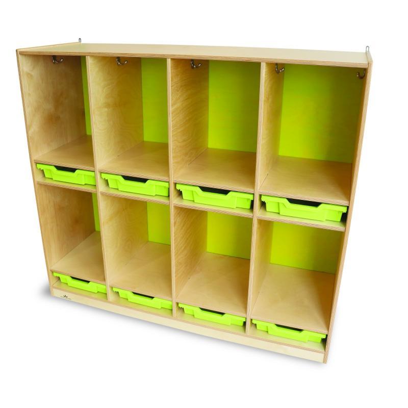 If you need compact coat locker storage, here's an inventive and attractive solution! The compact footprint and generous depth of this children's locker accommodates eight students in eight separate storage sections without any compromise in features. Each coat compartment is 17"D x 12.75"W x 18"H and features two safe, sturdy double prong hooks to hang coats, backpacks and hats, an interior back panel stained in vibrant green and ample room for lunchboxes. Directly below each coat section is a separate 17"D x12.75"W x 3.37"H compartment for books, binders or papers and includes a shallow Gratnell tray in vibrant green that matches the color of the coat compartment. Wall-mounted brackets for safety and floor glides included. Furnish your classroom with all the coordinated furniture elements in our Whitney Plus collection! Constructed in beautiful, durable 3/4-inch birch plywood and 1/4-inch birch plywood back panel with no visible screws or joinery for a fine finished furniture look in safe, non-toxic natural UV finish that won't yellow and withstands rigorous use. Made in USA. GreenGuard™ Gold certified. Lifetime Warranty.